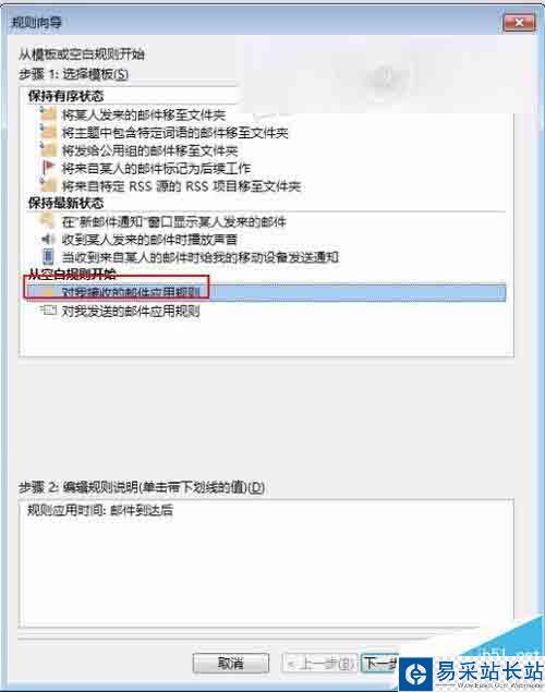 3、在“規則向導”第一步,選擇最下面的“對我接收的郵件應用規則”這一項,點擊“下一步”按鈕: