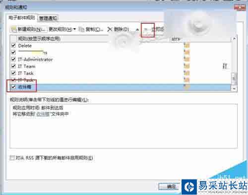 11、注意了,還有一個關鍵的地方,需要通過右上方的移動按鈕將這條規則移動到最后面,否則你有其它規則的話也是無效的或者重復接收郵件: