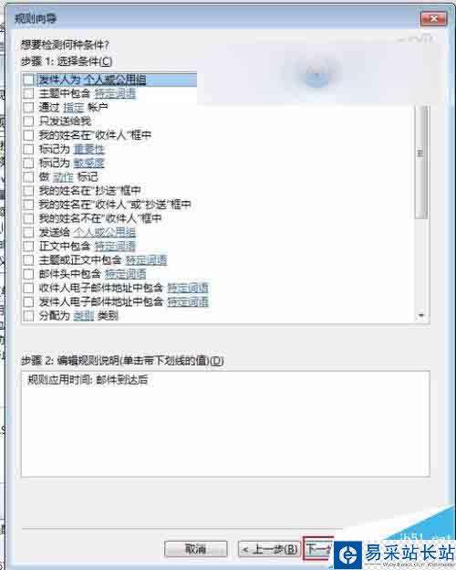 4、注意了,在“想要檢測何種條件”這一步中,不要選擇“步驟1:選擇條件”下的任何一項,直接點擊“下一步”按鈕繼續: