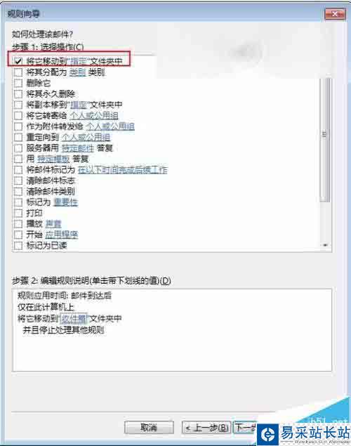 6、接下來,先在“步驟1:選擇操作”中“指定”文件夾為本地PST文件下的“收件箱”: