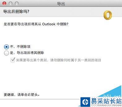 3、在詢問窗口中,『導出后刪除嗎?』,點選『不,不刪除項』;或點選『是,導出項后將其刪除』;選擇完成后,單擊右下角的『右剪頭』。