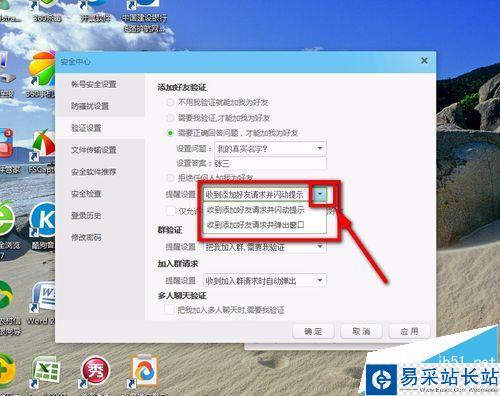 8、設置好驗證問題后我們還可以看看這個頁面里的其它選項,我們看到下方有“提醒設置”,里面有收到添加好友是閃動提醒還是彈出窗口提醒的方式,跟具我們的需要進行設置。