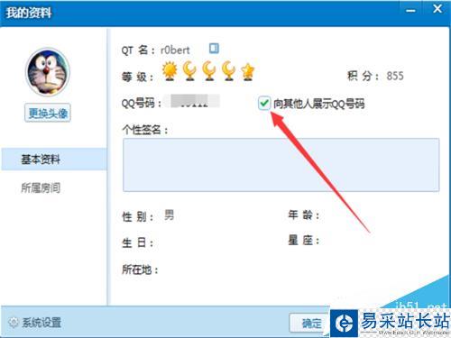 4、然后彈出一個個人資料設置頁面,把【向其他人展示QQ號碼】前面的鉤鉤去掉。