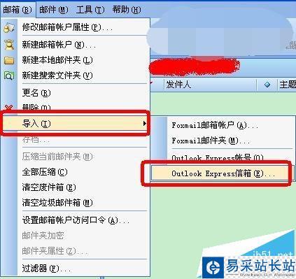 4、打開“Foxmail”,選擇“郵件”->“導入”->“Outlook Express信箱”。
