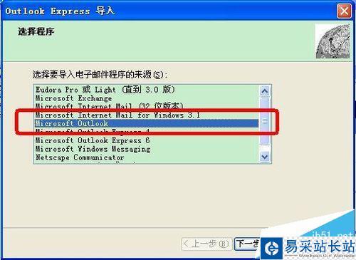 2、在“Outlook Express”中,點擊功能菜單條中的“文件”->“導入”->“郵件”,彈出郵件導入向導頁面,選擇“Microsoft Outlook”,點擊“下一步”。