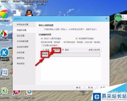 6、然后會彈出來一個對話框,我們在中間的“過濾騷擾消息”的文字框內輸入我們想過濾消息的關鍵詞,然后點擊確定,如下圖所示: