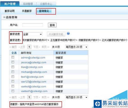 6、管理員啟動搬家功能后,請通知用戶通過企業用戶登陸界面登陸,啟動搬家;管理員可以通過郵箱搬家的“查詢情況”,查看搬家進度,狀態顯示。