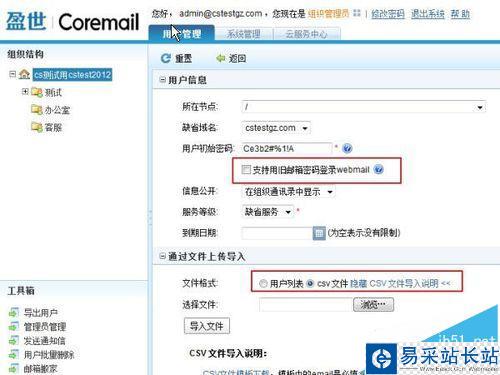 2、若公司用戶數較多,可以通過“用戶管理”—“高級”—“批量導入”,通過csv文件導入相關賬號。