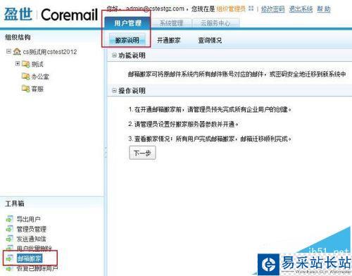 3、管理員創建用戶后,通過“郵箱搬家”啟動搬家功能;