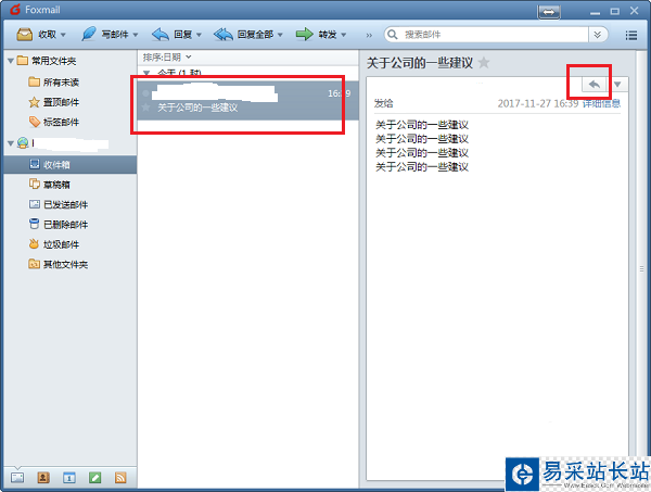 2、我們點擊要快速回復的郵件,選擇右邊的彎箭頭圖標,進行快速郵件回復,如下圖所示: