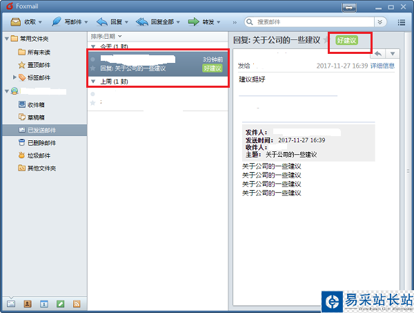 6、將新建的標簽添加到郵件上,可以看到郵件已經標記了一個好建議的綠色標簽,如下圖所示: