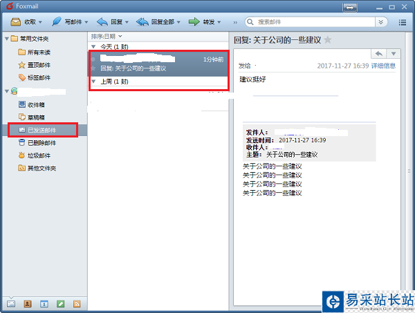 4、我們也可以點擊已發送郵件,可以看到我們剛剛快速回復的郵件在里面,如下圖所示:
