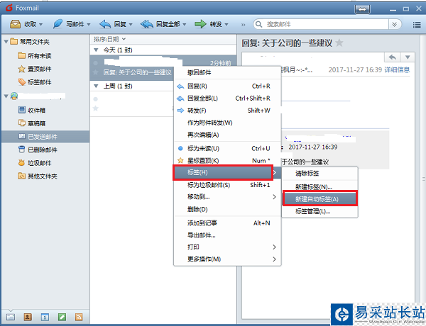 5、我們也可以對一些郵件進行打標簽標記,鼠標右鍵右鍵選擇“標簽->新建自動標簽”,如下圖所示: