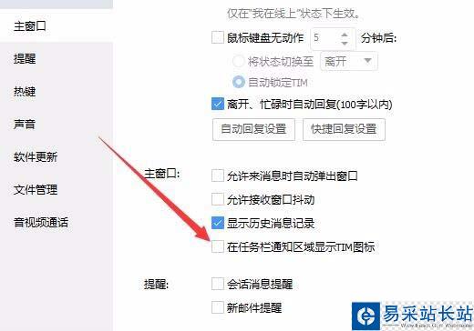 4、這時在右側窗口中找到“主窗口”設置組,選中“在任務欄通知區域顯示TIM圖標”前面的復選框,最后點擊確定按鈕 。