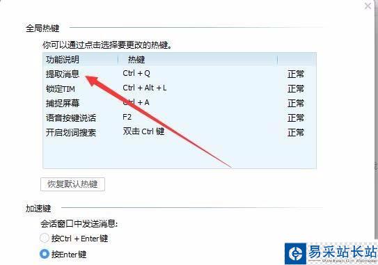 3、這時就會看到“全局熱鍵”設置窗口,在這里找到“提取消息”一項,在后面的熱鍵一欄里設置好熱鍵,這樣以后按下該組熱鍵,就可以快速的提取TIM的消息,或是打開TIM的主窗口界面了。