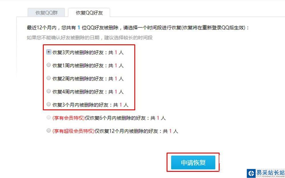 4、登錄QQ官網后,可以看到如圖所示的頁面,在頁面的列表中選擇恢復的條件,然后點擊下方的【申請恢復】。