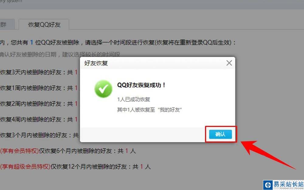 5、點擊申請恢復后,頁面就會彈出一個“QQ好友恢復成功”的信息提示頁面,你登錄你自己的TIM賬號就可以發現加入黑名單中的好友又重新回來了。