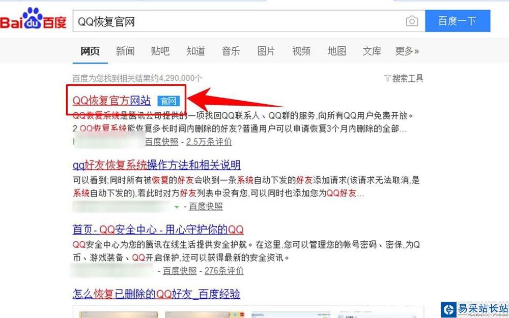 1、首先,在百度搜索引擎中輸入“QQ恢復官網”,在搜索結果中點擊進入QQ恢復官方網站。