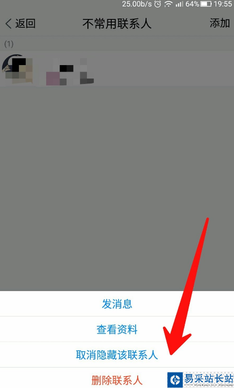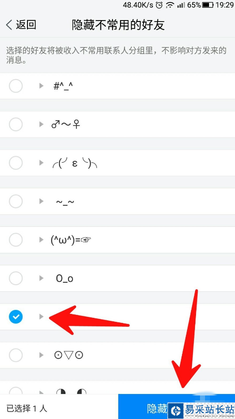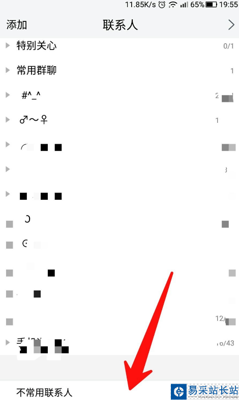 5、隱藏成功之后,退出到好友列表中,查看最下面“不常用聯系人”即可查看剛剛被隱藏的好友,點擊其,在下方彈出的選項框中即可進行恢復好友等操作!