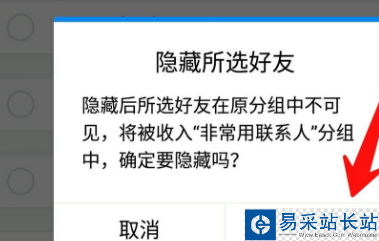 4、在彈出的隱藏好友提示框中,點擊圖中的“確定”即可將所選中的好友隱藏。