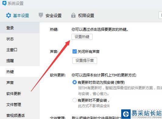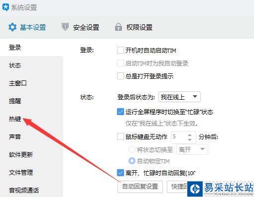 3、這時會打開TIM的系統設置窗口,在窗口中點擊左側邊欄的“熱鍵”菜單項。