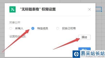 6、在打開的權限 設置窗口中,如果只是對部分人可見的話,可以選擇“特定成員 ”一項,然后點擊下面的“添加”按鈕。
