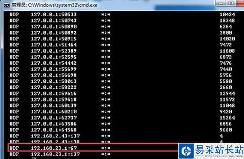 2、然后運行netstat -a -p udp -o(回車)這個命令符查看占用端口的程序,并找到占用192.168.23.1(24.1~33.1)的67端口的程序,記住它的PID。