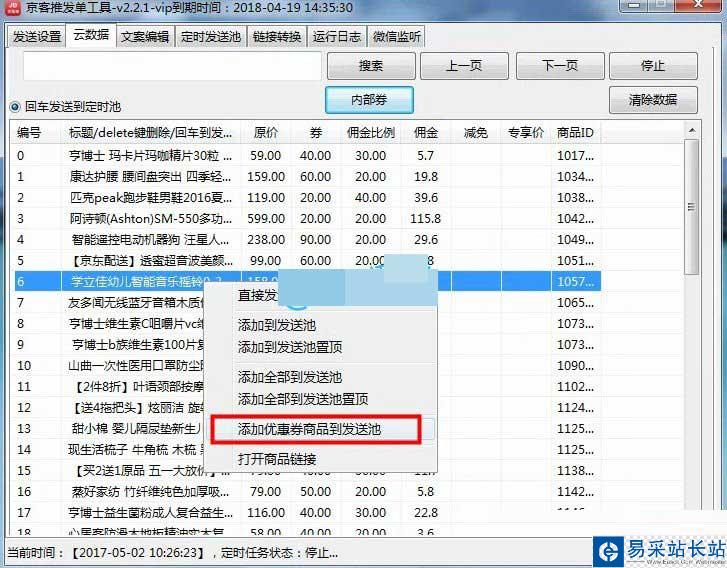 5.添加優(yōu)惠券商品到發(fā)送池。將鼠標(biāo)移動到任一商品上,右擊,選擇【添加優(yōu)惠券商品到發(fā)送池】,該頁有優(yōu)惠券的商品,就成功的添加發(fā)送池中了;其他頁面的商品,添加方法同上。. [' }5 j6 M6 b$ z1 x' H7 I0 v/ z: `