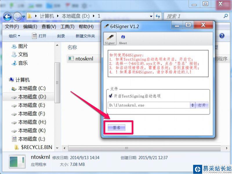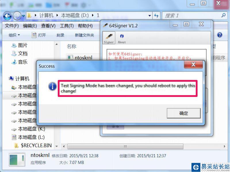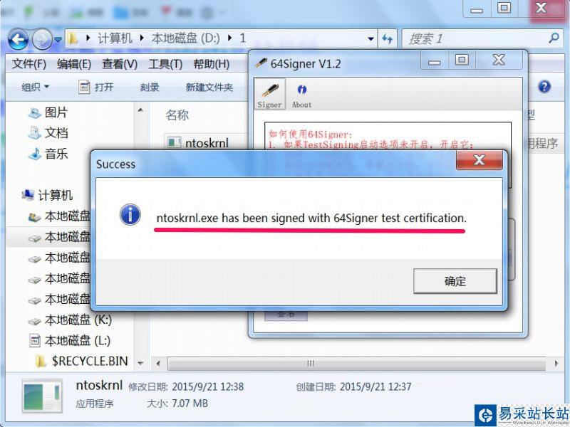 5、簽名成功后,會(huì)彈出“ntoskrnl.exe has been signed with 64Signer test certification”這樣的提示,如下圖。