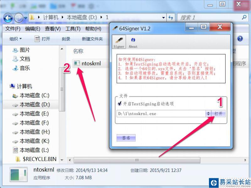 2、先從網(wǎng)上下載64signer,直接用“64signer”百度一下。下載后,打開軟件,點(diǎn)“打開”,加載要簽名的文件,也可以直接拖曳到軟件界面。