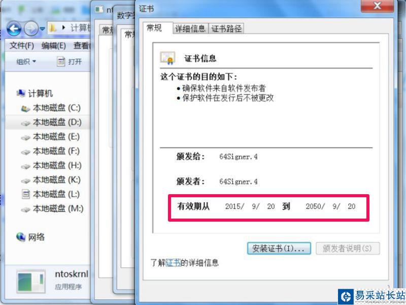 7、再打開ntokrnl文件的屬性->數(shù)字簽名->常規(guī),可以看到有效期改變了,文件也可以正常使用了。
