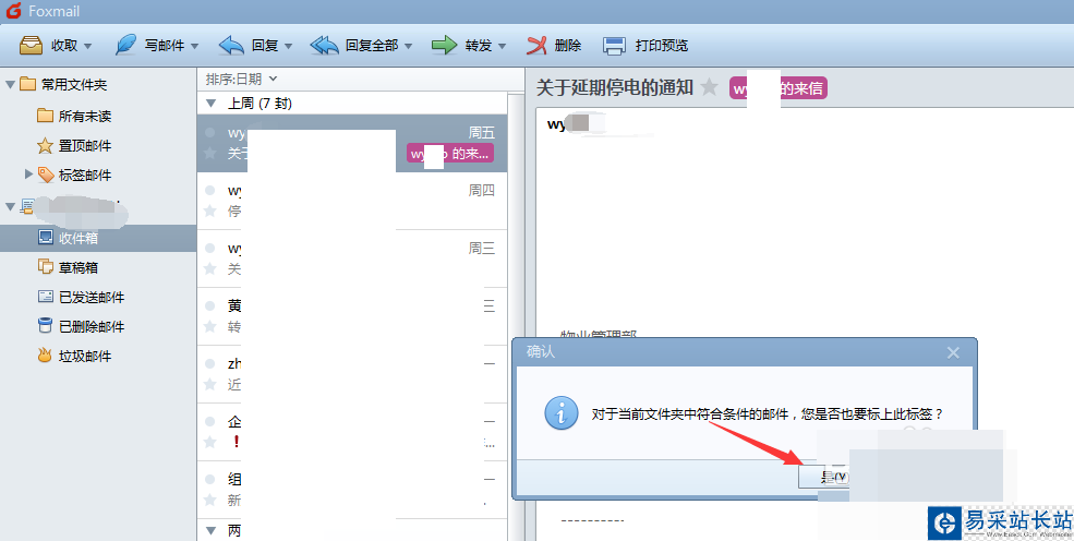 6、點擊確定,郵件就設置上標簽了,但是還會彈出一個確認小窗,如圖