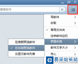 3、登錄進去后,可以看到郵箱界面右上角有個小標(biāo)識,點擊它,根據(jù)里面的“界面布局”設(shè)置郵件預(yù)覽方式,如下圖所示。這里以“在右側(cè)預(yù)覽郵件”為例。