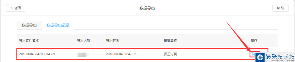 8、在數(shù)據(jù)導(dǎo)出記錄里就可以看到剛才導(dǎo)出的員工訂餐記錄。只要點(diǎn)擊右邊的下載就可以下載一份訂餐記錄的EXCEL表格文件。