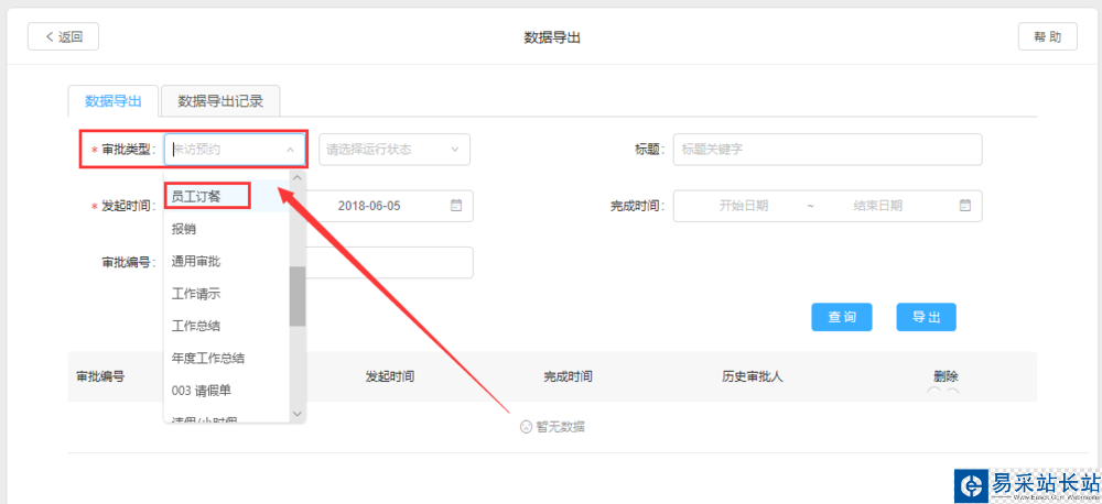 4、在數(shù)據(jù)導(dǎo)出的審批類型里選中員工訂餐。