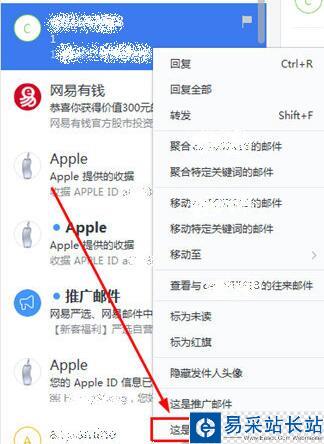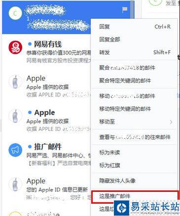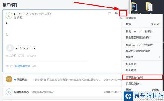 2、第一種辦法,選擇不想看到的郵件,點擊右鍵,選擇“這是推廣郵件”選項,如下圖: