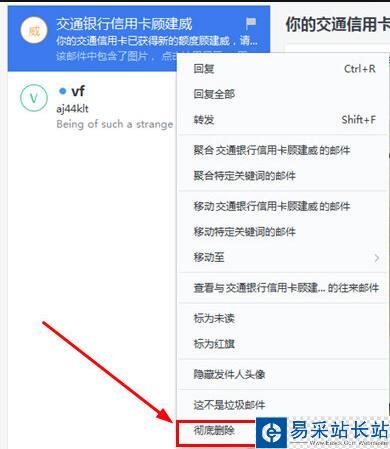 8、實在忍無可忍了?右鍵點擊郵件后選擇“徹底刪除”選項,對方的郵件將再也不能發(fā)送到您的郵箱上,如下圖: