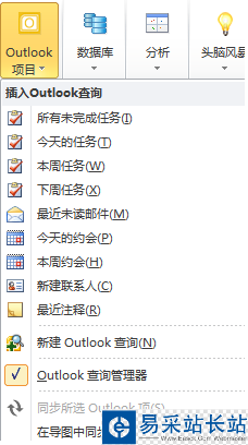 1、在任務選項卡上的發送任務到組或高級選項卡上的查詢組里,點擊Outlook項目,啟用Outlook查詢管理器。