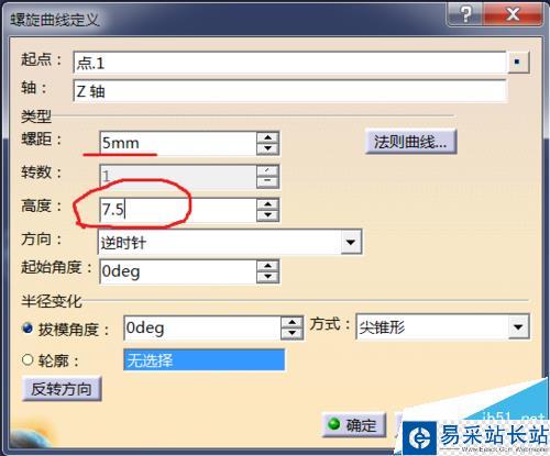 4、右鍵軸,選擇X或Z軸。(由于點在Y軸上,所以選擇X或Z軸,便于我們操作。)這里我們選擇Z軸。螺距5,高度7.5.這里要注意,高度一定是螺距的1.5倍!!!后面多余的部分會被切除。確定,生成第一段螺旋曲線。