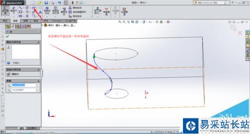 3、我們把剛剛放樣切割的步驟刪除,在進入草圖,選擇橫向基準面,用樣條曲線繪制一條上下草圖的連接線,如圖所示