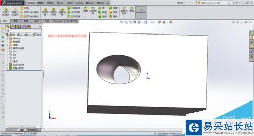 4、完成草圖后,再次點擊放樣切割,選擇上下平面草圖為輪廓,選擇樣條曲線為引導線,進行放樣特征的創建,最后切割后的效果如圖所示