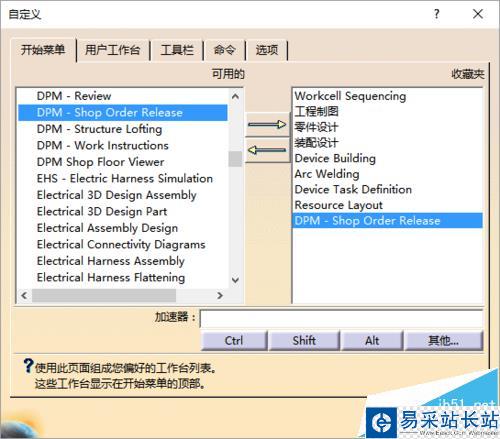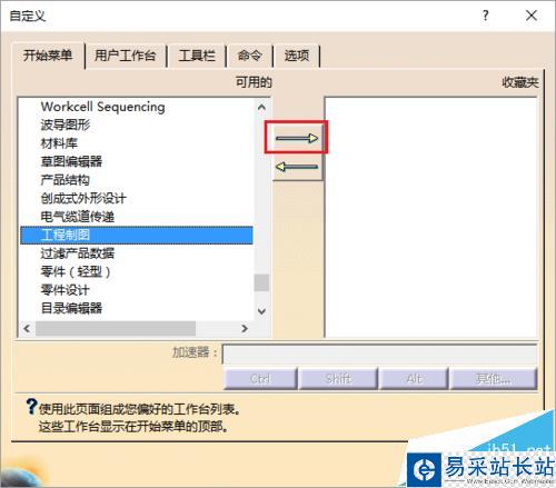 2、在彈出的“自定義”對話框的左側(cè)窗口中,選中您經(jīng)常需要用到的模塊,如“工程制圖”,點擊中間的向左的箭頭,將該模塊添加到右側(cè)窗口中;