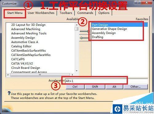 2、快捷鍵設置的時候分兩種情形:(1)工作平臺切換(2)常用工具命令的設置。工作平臺切換最為常用。