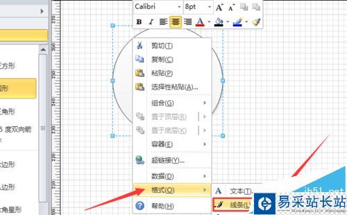 3、選中圓形,單擊鼠標右鍵,選擇“形狀”-“線條”選項,對其線型進行編輯,如圖所示。