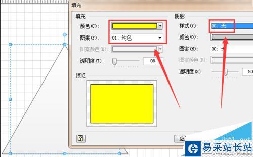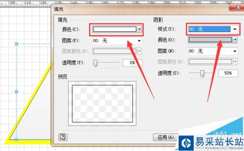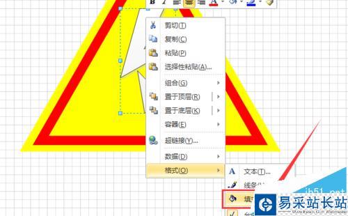 2、接著,從左側形狀欄中拖入一個“三角形”,并單擊鼠標右鍵,選擇“格式”-“填充”選項,將三角形的填充顏色設置為“純黑色”,陰影設置為“無”,如圖所示。