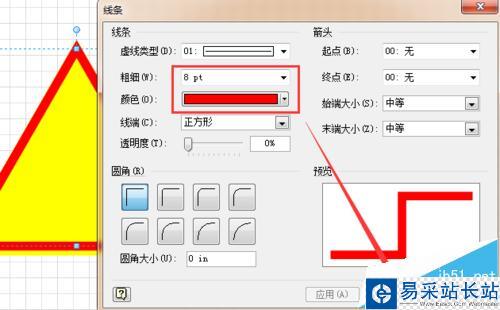 4、然后,繼續從左側形狀欄中拖入一個“三角形”,單擊鼠標右鍵,選擇“格式”-“填充”選項,將其填充設置為“無”,陰影也設置為“無”;此外,按照上述方式,將這個三角形的線條設置為“8pt,純紅色”,如圖所示。
