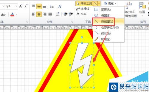 5、接著,選擇上方“折線圖”工具,在兩個三角形中間繪制一個“閃電箭頭”的樣式,且繪制過程中,首尾點要重合,使整個形成為整體,如圖所示。