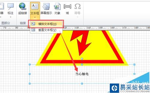 7、最后,選中上方“插入”-“文本框”-“橫排文本框”選項,輸入“當心觸電”字樣;同時,把字體設置為“紅色、36pt、黑體”,如圖所示。