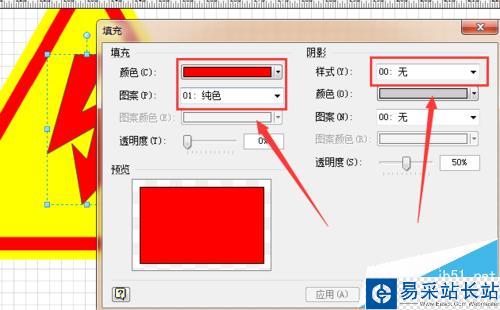 6、選中閃電箭頭,單擊鼠標右鍵,選擇“格式”-“填充”選項,將其填充顏色設置為“純紅色”,陰影設置為“無”,如圖所示。