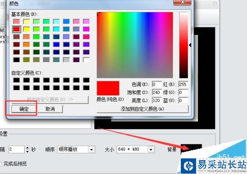 5、單擊顏色區(qū)域,彈出色板,設(shè)置背景顏色。選擇好顏色,例如紅色,單擊確定。
